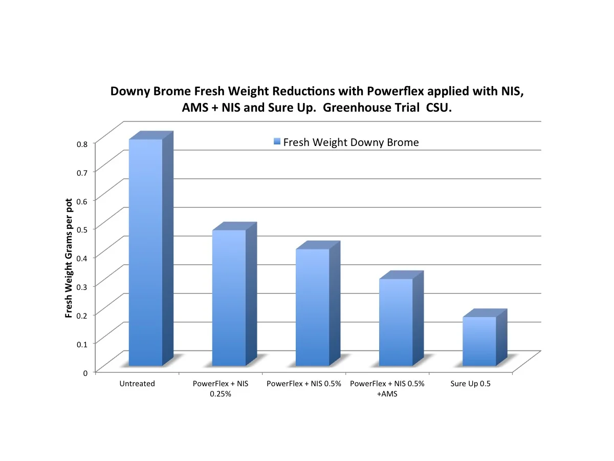 PowerFlex is a sulfonamide herbicide for grass weed control in wheat. Sure UP increases the efficacy of PowerFlex. Below is a graphic representation of the herbicide activity measured by the weight of the downey brome plants harvested from various treatments. The lower the bar the better the downey brome control. Sure UP had a very positive effect on the herbicidal activity of PowerFlex.