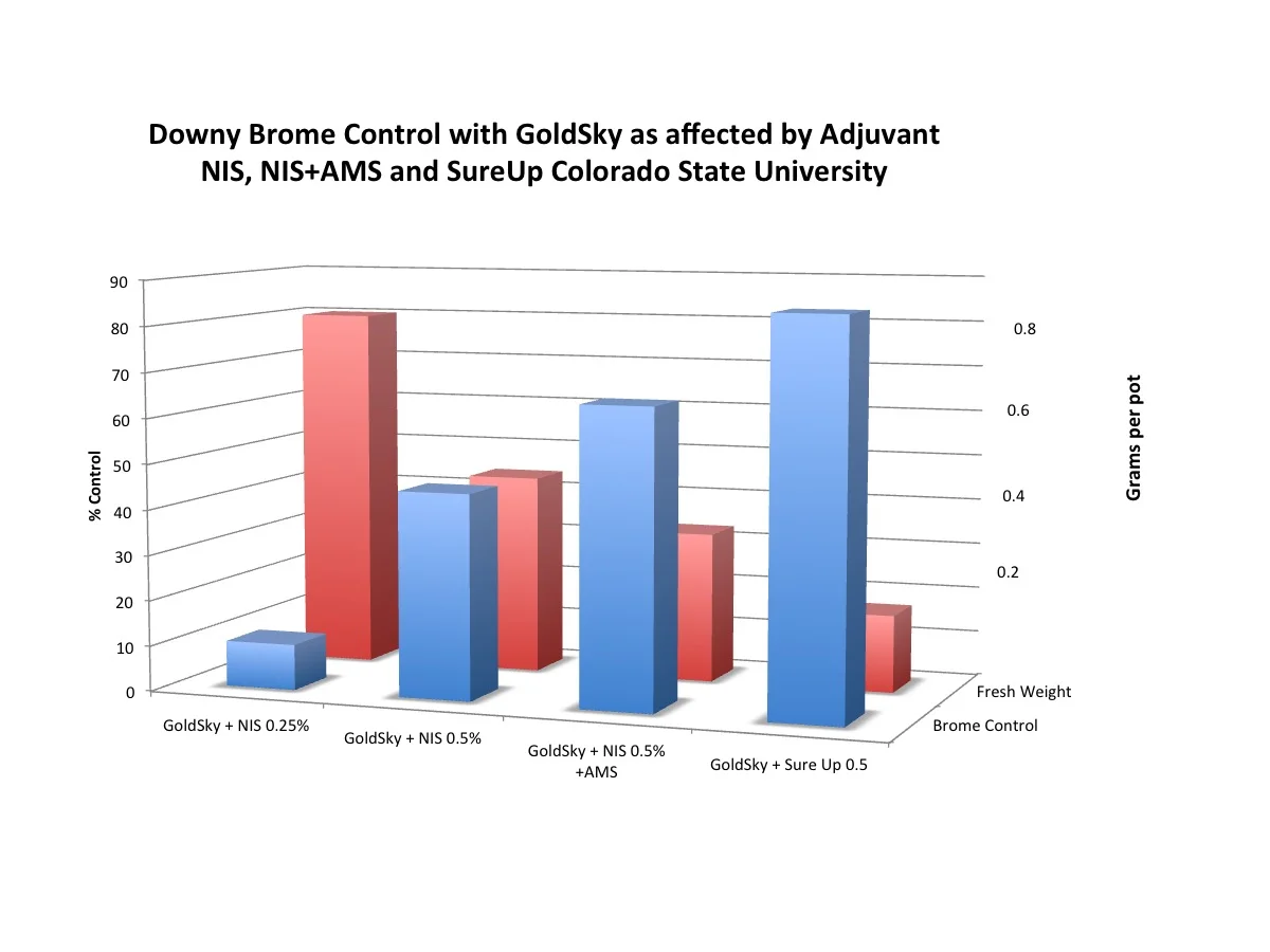 GoldSky herbicide is another herbicide with SU (sulfonylurea) type chemistry. As was seen with PowerFlex, GoldSky responds positively to the addition of Sure UP. Fresh weight of downey brome goes down. Brome control goes up with the addition of Sure UP as compared to standard adjuvants such as AMS and NIS.