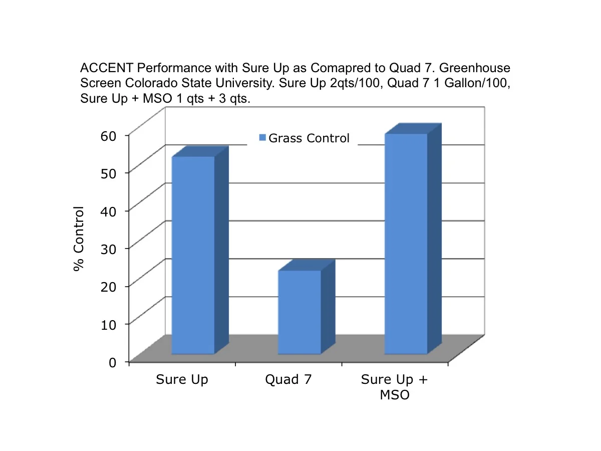 Accent & Beacon, both of these sulfonylurea herbicides respond well to the addition of Sure UP. Many Sulfonylurea herbicides like Accent respond to the addition of MSO. These SU's also respond to Sure UP. A good way to apply these herbicide is with a qt per 100 gallons of spray solution of Sure UP and 3 qts. per 100 of gallons of spray solution of MSO