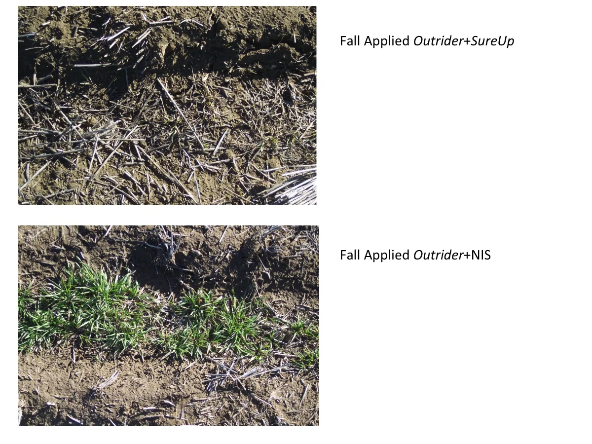 Outrider (Maverick) and Olympus like most SU herbicides respond well to the addition of Sure UP spray adjuvant. Below see results that show the performance of Sure UP as compared to other spray adjuvants.